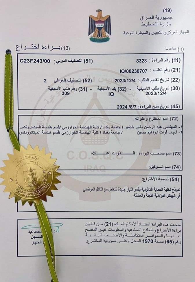 The University of Baghdad obtained a joint patent on a new model of a forced current cathodic protection cell to deal with localized corrosion in fixed and mobile steel structures.